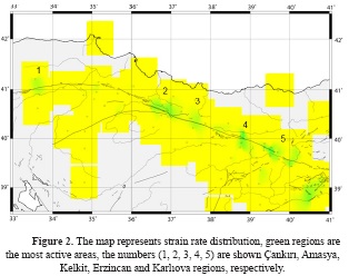 In this study, the aim is to combine previous micro-scale geodetic studies and an estimate of the earthquake potential of the region using strain analysis computation (Write et al., 2001; Reilinger et al., 2006, Ozener et al. 2010; Yavasoglu et al. 2011; Tatar et al. 2012). The variations of the slip/strain rate and deformations in the study areas were investigated through a rigorous combination of the published micro scale geodetic data as a primary and new contribution.