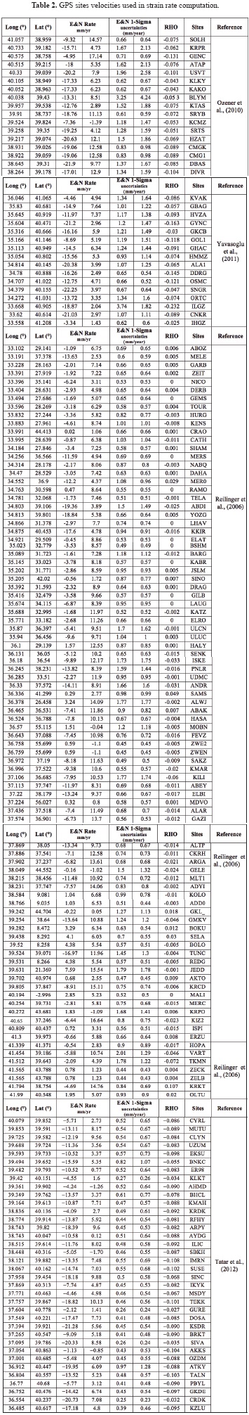 In this study, the horizontal GPS velocity fields published by Reilinger et al. (2006), Ozener et al. (2010), Yavasoglu et al. (2011) and Tatar et al. (2012) will be used as a reference. These velocities have been estimated from at least 3 GPS campaigns and have been computed by using geodetic GPS process software such as GAMIT/GLOBK and BERNESE. Therefore, the velocities are accurate to the sub-millimeter level.