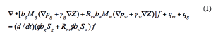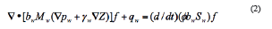 where, f indicates fracture systems, Δ is the gradient operator, Δ• is the divergence operator, bn (n = g or w) is the gas or water shrinkage factor, γn (n = g or w) is the gas or water gradient, Rsw is gas solubility in water, φ is effective fracture porosity and Z is the elevation.