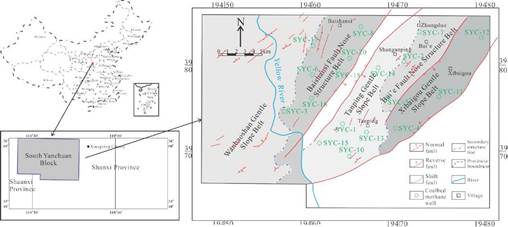 The South Yanchuan Block is situated in the southeast of Ordos basin, China. The study area is a monoclinal structure with a northeast trend and a western dip. Although the Ordos Basin has experienced repeated geologic history, specifically the Indosinian movement, the Yanshan movement and the Himalayan movement, the structure in the study area is simple. The structure can be divided into five third-class structural units, the Xibaigou gentle slope belt, the Bai'e fault nose structure belt, the Tanping gentle slope belt, the Baishansi fault nose structure belt, and the Wanbaoshan gentle slope belt are distributed from east to west (Fig. 1) (Cai et al., 2014; Li et al., 2015; Yan et al., 2015). The South Yanchuan Block was compressed during the three main tectonic movements: NS trending, NW-NE trending, and NE-SW trending movements. The NS trending stress from the Indosinian period established the basement structure. The NW-NE trending stress from the Yanshanian period mainly controlled the structural characteristics, including the four large-scale faults and numerous small-scale faults. The magma activity in Yanshanian period was active, albeit insignificant in the South Yanchuan Block (Li et al., 2015). The hydrodynamics in the study area are complex, including a strong runoff and recharge zone, a weak runoff zone, a stagnant zone, a strong runoff zone, a weak stagnant zone and a deep stagnant zone, situated from the east to west (Cai et al., 2014). The Lower Permian Shanxi Formation (Pjs) No. 2 coal seam is the target stratum for the development of coalbed methane.