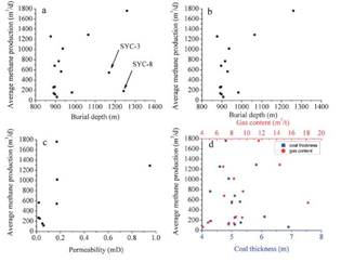 Figure 3 Relationship between burial depth, permeability, coal thickness and gas content with the average methane production