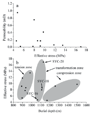 With increasing the reservoir burial depth, the reservoir effective stress increases, and the fracture network system tends to close (Laubach et al., 1998; Yao et al., 2009a), which would lead to an exponential decrease in permeability (Somerton et al., 1975; Gray, 1987). The permeability decreases with the increase in effective stress (Fig. 5a), due to the coupling of reservoir and closure pressures. The effective stress is also divided into three sections (Fig. 5b). The low closure pressure gradient indicates high permeability in the deep reservoir. Under the interaction between the low closure pressure gradient and the high reservoir pressure gradient, the permeability of the deep reservoir is generally more than 0.1 mD. This observation has validated the conjecture, which means the coalbed methane geological condition is superior in the deep reservoir.