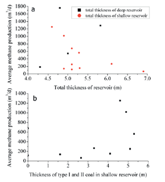 Generally, the higher the coal thickness, the larger the gas content the coal seam can maintain (Yao et al., 2009a; Lv et al., 2012). However, there is no marked correlation between coal thickness and coalbed methane production (Fig. 3). In the shallow reservoir, the relationship between coal thickness and coalbed methane production is even negative (Fig. 6a); mainly due to the development of Type III coal. The development of Type III coal can damage the reservoir permeability (Li et al., 2015), and desorption of methane adsorbed at the surface of the coal matrix is difficult, resulting in low methane production. When the coal thickness is adjusted to the thickness of Type I and II coal, the methane production increases exponentially (Fig. 6b).