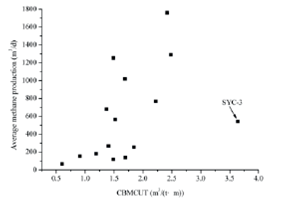 CBMCUT is a combined reflection of coal thickness and gas content; it increases exponentially with average methane production (Fig. 7). CBMCUT also has a relationship with the coal structure, and decreases with increasing coal thickness. This effect is mainly due to the resistance of tectonic deformation of thick coal; with thinner coal (1-2 m) more easily deformed than thick coal (> 5 m) (Lei et al., 2012).