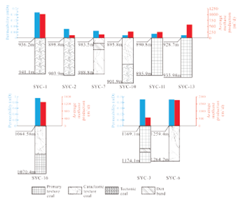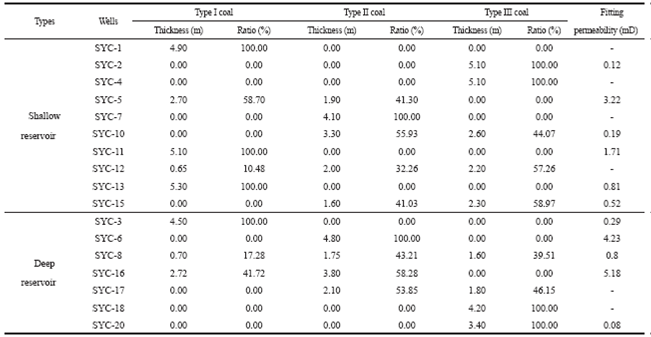In the shallow reservoir, the development of Type III coal results in the low permeability, as values are always below 0.1 mD (Table 1, Fig. 5). The permeability of SYC-11 and SYC-13 coalbed methane wells with the Type I coal is still low, mainly due to low reservoir pressure, and insufficient stratum energy to keep the fracture open. The deep reservoir has a single coal structure is, and the permeability is higher than that in the shallow reservoir. The development of Type I and II coal can maintain high permeability, which indicates that the Type II coal can promote the increase of permeability (Fig. 8).