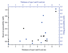 Figure 9 Relationship between thickness of Type I and II coal and permeability