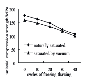 The test data and Figure 4 show that, the strength of andesite rock samples decreased by different amount under various freeze-thaw cycles. The strength of naturally saturated rock samples decreased by 7.66% (equivalent to 13.5 MPa) after 10 cycles, 16.5% (equivalent to 29.1 MPa) after 20 cycles, 30.17% (equivalent to 53.2 MPa) after 30 cycles and 39.4% (equivalent to 69.4 MPa) after 40 cycles, respectively. For rock samples saturated by vacuum, the strength decreased by 7.03% (equivalent to 11.1 MPa) after 10 cycles, 14.88% (equivalent to 23.5 MPa) after 20 cycles, 25.84% (equivalent to 40.8 MPa) after 30 cycles and 36.86% (equivalent to 58.2 MPa) after 40 cycles.