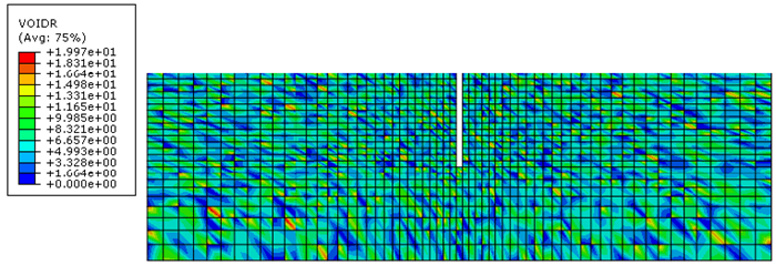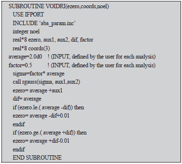 The non-homogenous fields of fine content were simulated through a special FORTRAN subroutine (INTEL(R) , 2007) compatible with ABAQUS. The software provides the user subroutine VOIDRI which enables to create an initial field, usually the void ratio, and permits to establish a direct relation between this variable and the hydraulic conductivity. Hence, we have used this user subroutine to write a FORTRAN code able to produce a random value for the fine content following the aforementioned Gaussian distribution. The code is given in Appendix A. The subroutine inputs correspond to the mean value and standard deviation a, which are controlled for each simulation.