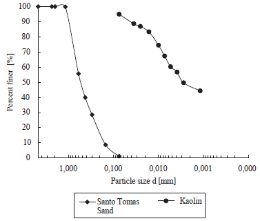 The Santo Tomás sand is a uniform sand with a fine content of 1.21%, uniformity coefficient of C u = 4.08, curvature coefficient of C c = 0.98, effective diameter of D 10 = 0.16 mm, specific gravity of G s = 2.65, maximum void ratio e max = 0.91 and minimum void ratio e min = 0.54. The latter values are related to maximum and minimum dry densities of ρ dmax = 1.72 g/cm3 and p dmin = 1.39 g/cm3 respectively. According to the Unified Soil Classification System USCS, the Santo Tomás sand is classified as a poorly graded sand SP. The results are shown in Table 2. The grain size distributions for the Santo Tomás sand and the Kaolin clay, obtained by sieve analysis and hydrometer analysis respectively, are shown in Figure 1.