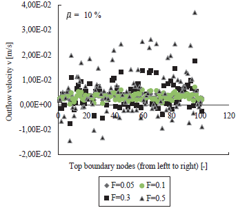 Figure 7 Outflow velocity at the top boundary nodes. Mean fine content of