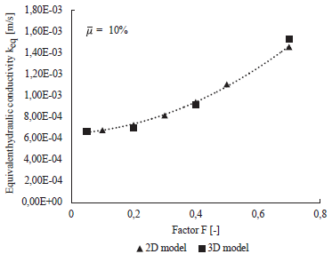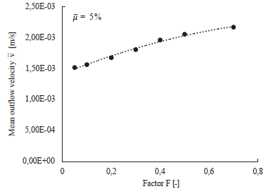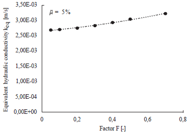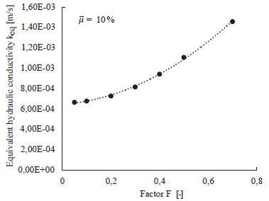 , see Figure 7. The resulting mean outflow velocity, denoted by v, is plotted in Figure 8. It is reminded that the mean outflow velocity results from averaging the outflow velocities v. The results clearly indicate an increasing behavior of the mean outflow velocity v for increasing values of F. The resulting equivalent hydraulic conductivity keq, computed with Equation 7, is plotted in Figure 9 and presents the same trend. Hence, one may conclude that the equivalent hydraulic conductivity keq depends on the spatial distribution of the fine content. Similar results were obtained for a mean fine content of