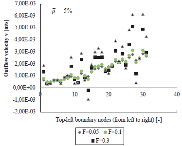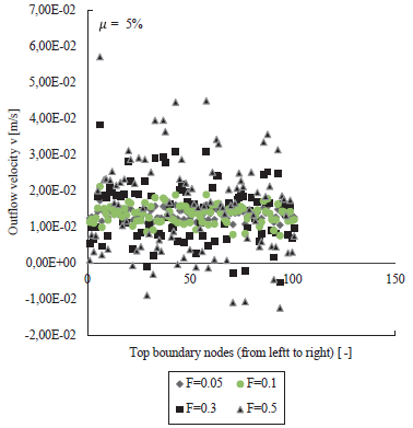 = {5%,10%} with different values of the standard deviation a are plotted from Figure 7 to Figure 12. Figure 7 presents the resulting outflow velocity v for each node located at the top boundary for