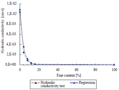 Figure 2 Results and adjusted regression of hydraulic conductivity test for different fine contents (T=20°C)