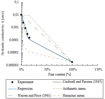Figure 3 plots once more the obtained results of the permeability tests, and compares it with the adjusted regression and other correlations reported in the literature for sand-clay mixtures. It includes the relation by (Warren & Price, 1961), (Cardwell & Parsons, 1945), and others as the arithmetic mean and harmonic mean as a function of the fine content FC. A brief summary of these relations is given in Appendix B, while their analysis may be found in other works, e.g. (Luijendijk & Gleeson, 2015). Notice that the relation by (Cardwell & Parsons, 1945) includes parameter , which must be adjusted. The cases p = 1 and p = -1 correspond to the arithmetic and harmonic means respectively. For the particular correlation by (Cardwell & Parsons, 1945), it has been found that a value of p = -0.4 matches well the obtained results. The fact that parameter p is lower than zero, indicates that the hydraulic conductivity is mostly dominated by the clay portion (Luijendijk & Gleeson, 2015).