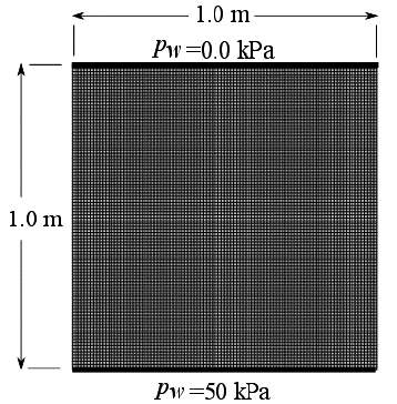 The simulation considers a squared domain of a large soil sample, with dimensions of 1 m wide times 1 m high. The aim is to simulate the test depicted in Figure 4, wherein a vertical upward flow is experienced by the soil due to an imposed hydraulic gradient. Small sized finite elements were used (of 0.01 mx 0.01 m) for the BVP. At the top boundary, a pore water pressure equal to p w = 0 kPa is fixed as boundary condition to allow its drainage. At the bottom, a water pressure of p w =50.0 kPa is given to produce the pressure differential. The geometry, mesh and boundary conditions are depicted in Figure 5.
