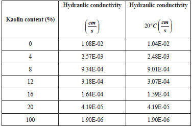 Results of hydraulic conductivity tests of the sand-clay mixtures