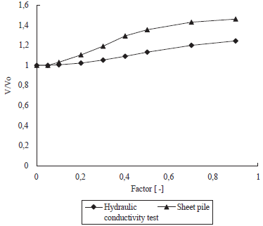 is the initial pore water pressure, is plotted in Figure 18. In general, these plots show the typical flow net of a water flow around a sheet pile wall. Once more, the nodal outflow velocities, from the left top boundary, are plotted in Figure 19. The results show that for nodes closer to the sheet pile, the outflow velocity increases. Dispersion is again obtained in these results due to the heterogeneity of the fine content. Their mean values are plotted in Figure 20 and similar to the hydraulic conductivity test simulation, it shows an increasing behavior for increasing standard deviation. For comparison purposes, we have now plotted in Figure 21 the response of the normalized velocity