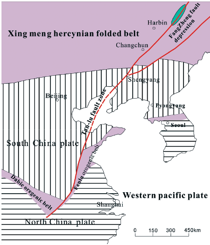 Fangzheng fault depression is a series of narrow and Cenozoic fault basin distributed in the northeast direction in the Tan-lu fault zone, which stratum develops from bottom to top:Cretaceous (K), Paleogene Paleocene Xin'ancun Formation (E1x), Eocene Dalianhe Formation (E2d), Oligocene Baoquanling Formation (E3b: E3b1, E3b2, E3b3), Neogene Fujin Formation (Nf), and the Quaternary (Q) stratum, generally in the direction of the North East 40 °-50 °, the area is about 1460km2.