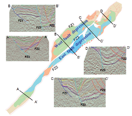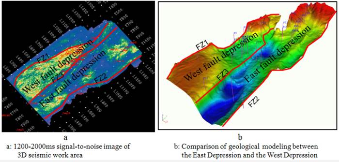 The fault depression has controlled by three faults (Fig. 2). FZ1 is the western strike-slip pull-apart fault boundary; FZ2 is the eastern strike-slip extrusion fault boundary; FZ3 is the middle strike-slip regulation fault. FZ1 and FZ3 control the Cretaceous basin; FZ1 and FZ2 control the Cenozoic basin. Hence, the fault depression has divided into the Western and Eastern fault depression by the FZ3 fault control. The internal fault structure of the West fault depression and the East fault depression is entirely different. The strata in the West fault depression are stable, the Cretaceous strata are developed, and the seismic data quality is good, the signal-to-noise ratio characteristic of the west fault depression is better than the east fault depression (Fig. 3a).