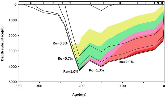 During the period of rapid deposition from late Carboniferous to the end of Late Triassic, the basin rapidly settled and the depth of the formation increased rapidly. As the depth of burial depth increased and the temperature increased, the organic matter became deeply metamorphic and the maturity gradually increased. During the middle stage of the Triassic, organic matter has entered the mature stage. At the end of the Triassic, the temperature was about 140°C and the Ro% reached 0.9%±. The source rock transited from the immature stage to the mature stage and reached the first hydrocarbon generation peak. In the II. Early Jurassic and III. Middle Jurassic stage, the whole basin was uplifted and then slowly settled, organic matter heating temperature gradually decreased, temperature increased slowly, and maturation evolution of the organic matter of source rock was weak. In the IV Late Jurassic-Early Cretaceous, due to the influence of magmatic events of the Yanshan period, the thermal evolution of organic matter greatly improved from maturity to over-maturation, and gas began to form in large quantities. V After the Middle Cretaceous, the organic matter heating temperature reduced, and there was little progress in the evolution of source rocks.