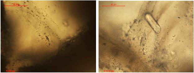 Under the microscope, the fluid inclusions were found in the microfissures of the quartz particles and they were all secondary two-phase fluid inclusions (Fig. 5). The analysis shows that these quartz particles are brittle after being heated by magmatic heating water, causing the quartz particles to break under the action of diagenesis or multi-phase tectonic stress. The magmatic heating water carries fluids such as CH4, CO2, and carbonaceous asphalt into the cracks; Then, fill up, precipitation, and cementation cause the fractures to shrink, forming microfractures in the quartz grains; the trapped gas-liquid fluid forms secondary fluid inclusions in the microfractures.