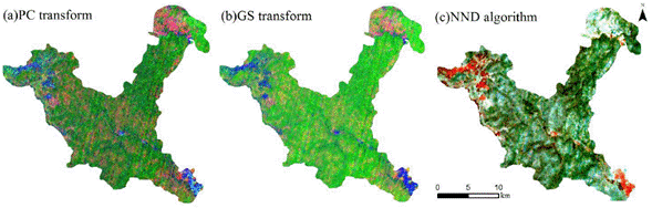 The PCA transform, GS transform and NND algorithm results of HJ-1A HIS image are shown in the figure (Fig. 3.)