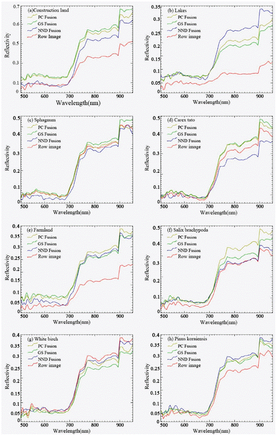 In the spectrum curve of construction land, the spectrum curve of PC, GS and NND fusion image is similar. Before 700 nm, the NND fusion image is lower than the original image spectrum curve, and after 720 nm, the spectrum curve of the three kinds of fusion image is higher than the original image. In comparison, the spectral fidelity of NND fusion image is better. In lake spectral curve, before 700nm, spectrum curves of three kinds of fusion image are almost the same, after 700 nm, spectrum curves of three kinds of fusion image are higher than the original image. It indicates that the spectral information of the water body of the three fusion images is seriously distorted, in which the change of the original spectral information by GS fusion is relatively small, while the change of the original spectral information by NND fusion is relatively large; The Sphagnum spectral curves of the three fusion images almost coincide with that of the original images, indicating that the fusion images have little influence on the Sphagnum spectra; The spectral curve of the Carex tato before and after fusion had the same trend before 700 nm, indicating that spectral fidelity was better. after 700 nm, The spectrum curve of NND fusion image is lower than that of the original image, while the spectrum curve of PC fusion image and GS fusion image is higher than that of the original image, and keep the same trend; The spectral curves of farmland before and after fusion, after 700 nm, the spectral curves of three fusion images and the original image presented significant differences and serious spectral deformation. The reflectance of the spectral curves of the three fusion images was much higher than that of the original image and show the same trend; The spectral curves of white birch, pinus koraiensis and spruce before and after fusion, the spectral curves of the three fusion images and the original images almost overlapped before 750 nm, indicating that the fusion images retained good spectral characteristics. After 750 nm, the original spectral curve of white birch was higher than that of the three fusion images, while the original spectral curve of pinus koraiensis and spruce was lower than that of the three fusion images, indicating that there was a certain degree of spectral deformation in the fused images.