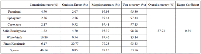 According to the classification results, SAM was used to classify the fusion image. The accuracy of PC fusion image classification was higher and that of GS fusion image classification was lower. Among them, the mapping accuracy of Pinus koraiensis is 79.23% to 83.56%, and that of spruce is 94.08% to 99.15%. There are often misclassification between Pinus koraiensis and spruce. In the commission errors, the values of spruce and white birch are relatively high. Among the three fusion images, the commission errors of spruce and white birch in PC fusion images are relatively low. In the Omission Errors, the values of Pinus koraiensis is larger, and the classification results of other ground objects are better because of the large difference in spatial details.