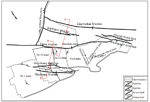 The eastern mining area is located in the eastern part of the Pingdingshan Coalfield, which includes the No. 8 mine, No. 10 mine, No. 12 mine, and Shoushan mine. The main geologic structure of the mining area is the Likou syncline; the axial direction is roughly NW50°, and the axial surface is nearly upright. The northwest limb is relatively gently dipping, the southeast limb is relatively tight, and the two limbs are basically symmetrical; the stratigraphic inclination of this structure is generally 5-15°. There are many secondary folds that were developed by the two limbs of the Likou syncline, which are mostly NW-oriented, including the Niuzhuang syncline, the Guozhuang anticline, the Baishishan anticline, and the Lingwushan syncline. The fault structure is very developed in the mining area and mainly includes normal faults and strike-slip faults. The fault directions are divided into two groups: one is NW, including the Baishigou fault, the Huoyan fault, the F1 fault, and the Niuzhuang reverse fault; the other is NE, including the Goulifeng normal faults and some small faults (Figs. 1-3).