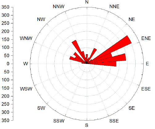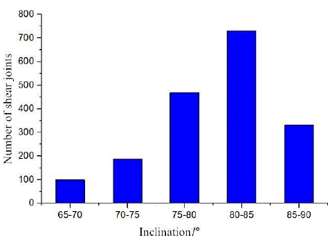 The conjugate shear joints in the eastern part of Pingdingshan are mostly high-angle joints, and the rose diagram of joint strike and the dip distribution histogram are drawn for the 1816 joints measured (Figs. 10-11). The results show that the joint trend is most developed with NEE, followed by EW and NNW, which reflects the role of the multi-period tectonic stress field in the study area. The joint inclination angle is most developed at 80-85°, followed by 75-80° and 85-90°. The high-angle joints belong to the early plane conjugate shear joints, after the slope of the stratum in the later period, the joint occurrence changes. Therefore the joint occurrence is corrected first, and then the direction of the tectonic stress field can be analyzed.