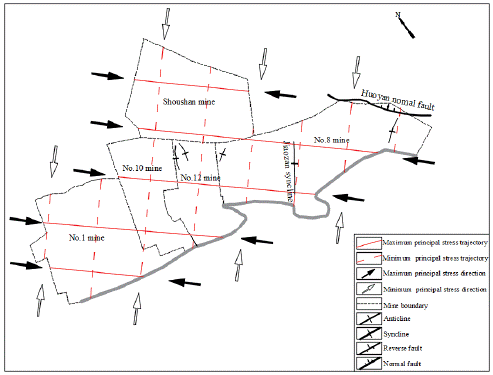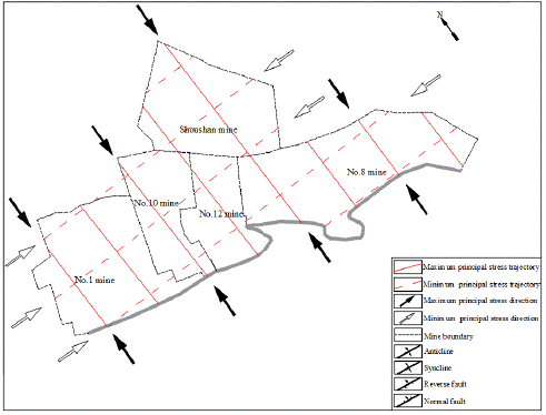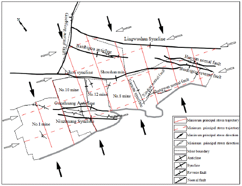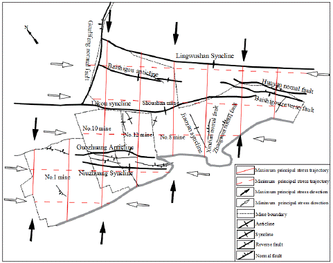 (2) Indosinian tectonic stress field is mainly characterized by the gradual uplift of coal-bearing strata, and a small number of near-EW-oriented small structures are formed in this period; The early-middle Yanshanian tectonic stress field is stronger than the Indosinian period. A small number of secondary and small fold structures with a near-NE direction are formed, such as the Jiaozan syncline. A small amount of near-NW secondary strike-slip faults and normal faults are also formed, such as the Huoyan normal fault. Moreover, a large number of small normal faults with NW or NNW strike are developed in the coal-bearing strata of the mining area; The late Yanshanian tectonic stress field has the strongest effect. A series of controlled fold structures and reverse faults in the mining area approaching the NW direction were formed during this period, such as Likou Xiangshi, Baishishan anticline, Lingwushan syncline, Niuzhuang reverse Fault, Baishigou reverse fault, et al. In addition some near-NE positive faults are formed in this period, such as the Goulifeng normal fault; Some secondary or small folds and faults were formed by the Himalayan tectonic stress field, and the structure formed in the early stage is reconstructed by the tectonic stress field.