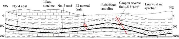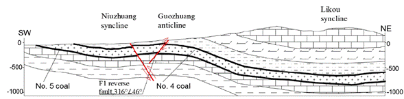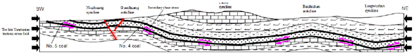 At the end of the Eocene, the Pacific plate swooped directly into the East Asian continent, moving in the direction of NWW, and acting strongly on the East Asian continent in the form of strong convection, leading to the rifting climax of the period during this period; At the same time, from the Late Jurassic to the Early Cretaceous, the Qinling-Dabieshan tectonic belt experienced a strong thrust-overlifting movement in the near-NS direction. The above tectonic movement caused the late Yanshanian North China plate to be subjected to the near-NE thrusting tectonic stress field. According to the inversion result of the conjugate shearing joint in the previous section, the study area was also subjected to a strong compressive stress field near NE in this period. The near NE direction of the compressive stress field causes the regional strata to undergo more intense fold orogeny on the basis of the pre-structural movement. A series of controlled fold structures and reverse faults in the mining area approaching the NW direction were formed during this period, such as Likou Xiangshi, Baishishan anticline, Lingwushan syncline, Guozhuang anticline, Niuzhuang syncline, Niuzhuang inverse. Fault, Baishigou reverse fault, the original eleventh reverse fault (Figs. 15-17).
