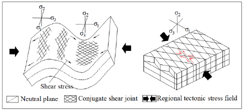 Joints are microfractures which are formed by the tectonic stress field acting on the rock stratum (Eyal, Gross, Engelder, & Becker, 2001; Bai & Pollard, 2000; De Guidi, Caputo, & Scudero, 2013). According to the type of tectonic stress field formed by joints, they are divided into tension joints and shear joints (De Guidi et al., 2013; Mandl, 2005). The relationship between shear joint and principal stress is similar to that of fault, but the accuracy of a shear joint inversion tectonic stress field is insufficient, and the reliability of conjugate shear joint inversion is greatly improved. Therefore, conjugate shear joints are commonly used in geological research to invert paleo-tectonic stress fields (Negrete-Aranda et al., 2010; Federico, Crispini, & Capponi, 2010; Veloso et al., 2015; Mazzoli, Santini, Macchiavelli, & Ascione, 2015; Naimi-Ghassabian, Khatib, Nazari, & Heyhat, 2015). The distribution of joints produced by the same tectonic stress field has a certain regularity, usually a large area is developed in the rock mass to form a specific structural pattern. The research area often experiences the multi-stage tectonic stress field. Each tectonic stress field forms a joint with a specific direction and mechanical properties. The joints formed in the early stage may be reconstructed by the late tectonic stress places, even superimposed with the joints formed by the late tectonic stress fields. Therefore, how to accurately match and stage the joint data is crucial for determining the direction and timing of the tectonic stress field. The staging of joints is to classify the joints produced by the tectonic stress field in different periods and divide the joints generated by the same tectonic stress field into a group. The matching of the joints is to determine whether the joints of different directions and properties are the products of the same tectonic stress field, that is, whether it is possible to form a conjugate shear joint. The shear joints of conjugate shear joints are formed in the same tectonic stress field, which should have similar spacing and density, and the joint fillings should be similar (Tang, Yang, Lv, Tang, Wang, 2018; Jiang et al., 2016; Fang, Sang, Wang, Shiqi, & Ju, 2017). Conjugate shear joints generally have microdislocations, and one set on the left, the other group on the right. The two shear joints with the above characteristics can be judged as conjugate shear joints, and conversely, they are not conjugate shear joints. If the observed joints are at the horizontal level or approximately at the horizontal level, the three principal stress directions can be directly inverted (Eyal et al., 2001; Rawnsley, Peacock, Rives, & Petit, 1998; Arlegui & Simon, 2001). The relationship between the spatial orientation of the three principal stresses and the conjugate shear joint is: The direction of the bisector of the acute angle between the two sets of shear joints is the action direction of σ1, and the direction of the blunt angle of the obtuse angle is the action direction of the minimum principal stress σ3. The intersection line direction of the two sets of shear joints face is the action direction of the intermediate principal stress σ2 (Fig. 4).