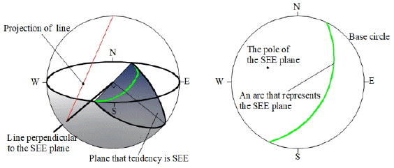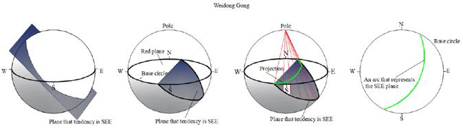 The rock formation usually has a certain angle with the horizontal plane, especially the structural areas such as faults and folds that may intersect the horizontal plane at a large angle. When using the shear joints in the inclined rock to carry out the stress field inversion, the joint production needs to use the stereographic projection method for azimuth correction (Eyal et al., 2001; Rawnsley et al., 1998; Arlegui & Simon, 2001). The projection tool of the stereographic projection is a sphere. The planar structure such as joint and linear structure can be expressed by the surface or line passing through the center of the sphere. The intersection of the planar, linear structure and the projection sphere is a circle and a point, respectively. All intersections between the planar structure and the lower hemisphere are connected to the pole (divided into upper and lower poles) by straight lines. These lines form part of the conical surface, and the intersection of this cone and the horizontal plane passing through the center of the sphere is an arc. This arc is the stereographic projection of the planar structure (Fig. 5), the projection principle of the linear structure is similar to the planar structure, and its red projection is a little (Fig. 6) (Fosse, 2010). The above pole is the connection point, called the lower hemisphere projection, otherwise, it is called the upper hemisphere projection. In the joint analysis of this paper, the lower hemisphere projection is used in this paper. The correction of the joint occurrence of the inclined rock layer is to project the observed joint onto the red plane through the stereographic projection theory. Around the strike line, the joint rotation is at the same angle as the inclination angle, and the rotation direction is opposite to the joint tendency, that is, the corrected shear joint data is obtained. The corrected joint occurrence data can be solved according to the relationship between the conjugate shear joint and the three principal stresses. In this paper, the conjugate shear joint occurrence is corrected by the stereo projection analysis software Stereonet 10.0, and the direction of the tectonic stress field is analyzed by the software. Conjugate shear joint inversion of paleo-tectonic stress fields has been successfully used in several studies (Federico et al., 2010; Mazzoli et al., 2015; Foeken, Bertotti, & Dunai, 2006).