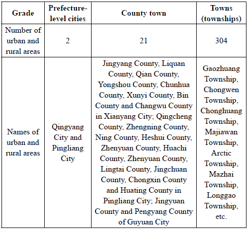 The urban-rural system planning of Jinghe River Basin, in accordance with the principles of urban-rural coordination, perfection of functions, development of small cities and towns, and highlighting special features, promotes the functions of the core cities of Pingliang City and Qingyang City, optimizes the urban form, cultivates such regional sub-central cities as Bin County, Changwu County, Jingyang County, Qian County, Liquan County, Qingcheng County, Ning County, Zhenyuan County, Huan County and Jingchuan County, and improves the urban and rural functions of Yongshou County, Chunhua County, Xunyi County, Lingtai County, Chongxin County, Zhengning County, Heshui County, Huachi County, Jingyuan County and Pengyang County, so as to accelerate the key towns building, form a urban and rural system of Jinghe River basin with regional characteristics of the Loess Plateau, and construct a five-level urban and rural system of core cities, regional sub-central cities, general cities, key towns and general towns. The scale of urban and rural classes in the Jinghe River Basin is shown in Table 3.
