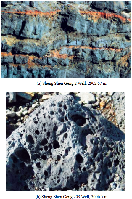 (2) Lava is dominant. The energy of fissure eruptive volcanic rocks is weak, and the eruptive products are mainly volcanic lavas, which generally contain only a small amount of pyroclastic rocks. This lithologic assemblage usually occurs in the Shengping-Anda area and the southern Fung Lok area in the northern part of the Xujiaweizi fault depression. The volcanic lavas are mainly dominated by acid rhyolite, while the northern part of the andesite is dominated by basic basalt and neutral andesite (Zong et al., 2018). Figure 3 (b) core image of the Shenshengeng 203 well shows that the top of the lava is usually very porous, reflecting the end of the eruption of the volcanic eruption, and the lava exposing the surface; at the end of the eruption, due to weathering and surface water communication, the pores on the top of lava are very developed. These large numbers of primary stomata are signs of the end of the eruption period.