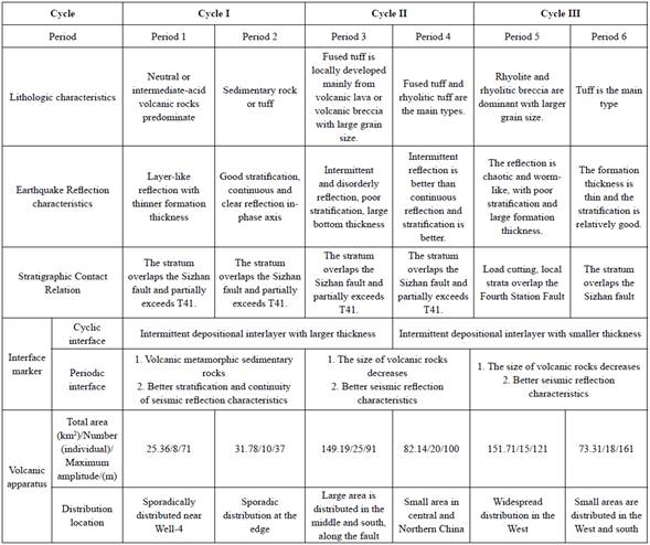 Cycle 1 is divided into stages 1 and 2 from bottom to top. The period 1 is mainly neutral or moderately acidic volcanic rocks. It shows layered like reflection in seismic sections. Sedimentary facies and sedimentary tuff are the main sedimentary facies in stage 2, and the thickness of sedimentary interbeds is about 150m. It can be used as volcanic eruption times alone, indicating volcanic eruption into a long quiet period. The activity of Fire Mountain is from strong to weak, and it shows good stratification and continuity in seismic profile, and is easy to track and compare horizontally.