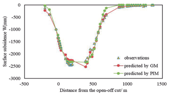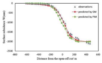 (3) 6 working faces buried under thick loose layers in Huainan mining area were selected in this paper to compare the fitting effect of the PIM and the GM using the ICSA. The results show that the GM has a better fitting result than the PIM at the boundary of the subsidence basin. Further confirmed that the GM is more suitable than the PIM for predicting surface subsidence caused by mining under thick loose layers. And the parameters of the GM and the PIM can take the same value except for r GM = r PIM / 2.5. This result helps the GM to be used in actual engineering