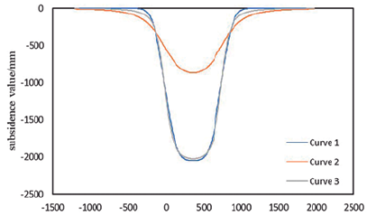 The strike main section predicts the result of using the PIM in combination with the above parameters is shown in curve 1 in Figure 2. And the result of using the GM in combination with the above PIM parameters is shown in curve 2 in Figure 2. By comparing curve 1 and curve 2 in Figure 2, it can be seen that the shapes and trends of the GM and PIM model curves are similar under the same set of parameters, but the calculated specific subsidence values are different. Then adjust the GM parameters to make r GM = r PIM / 2.5 and again use the GM to predict the subsidence of the strike main section to get curve 3.
