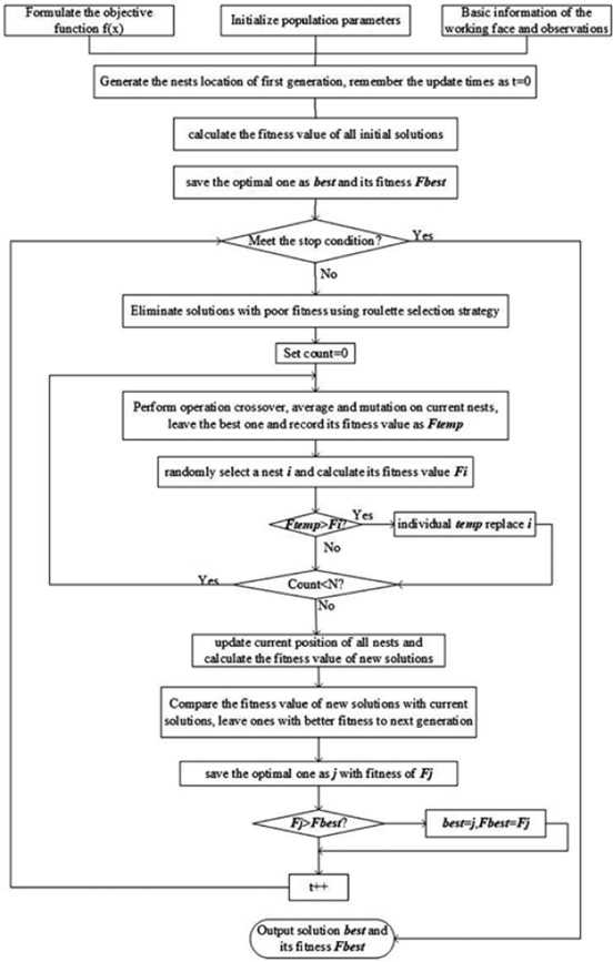 Set the total number of the nests as n=200 and each nest represents a set of parameters, which is [ q, tanβ, θ, S1, S2, S3, S4]T in the GM. The specific steps of calculating mining subsidence prediction parameters with the ICSA are shown in Figure 3.