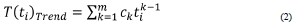 In the analysis of time series, firstly, the time-axis graph of the series is drawn and the unusual measurements (e.g., gross errors) are excluded to obtain a general interpretation of the series. A suitable low-pass filtering operation (e.g., five-order floating weighted average) is applied to the series to eliminate the noise effect in the series and reveal trend and periodic components more clearly (Erdogan et al., 2007; Gülal et al., 2013). Then, it is determined whether the series has a trend component, which represents long-term changes that can modeled by the polynomial function in the time domain as: