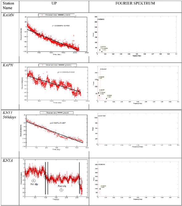 Figure 4 also shows the up time series, linear changes, function of linear change, and frequency spectrum of the same stations. Due to the high number of stations, the time series graphs of other stations are not given in this paper. However, linear functions and station velocities (annual) are given in Tables 1 and 2. The time series plots in Figures 3 and 4 were obtained by subtracting the first coordinate value of the time series of each station from the other coordinate values. In this case, the signal change at any time point in the time series is at the start time of the signal. It can be seen that the time series in the north and east directions of the stations show a linear increase in the same directions (Fig. 3). The same results were obtained in the time series of the other stations, but these are not presented in a figure. In addition, pulse movement was seen at marked points in the north and east time series and the last part of the series in KNYA. This was even more prominent for the up coordinate values (Fig. 4). For this reason, before and after the first pulse were taken into account separately in the calculation of the velocities at the KNYA station for north, east and up coordinate time series. Due to the insufficient amount of data after the second pulse, the remaining days were not taken into account. This situation is shown in the Figure 4. The linear movements (velocities) and periodic movements of the stations given in Figures 3 and 4, as well as those that are not presented in this paper were determined by performing time series analysis.