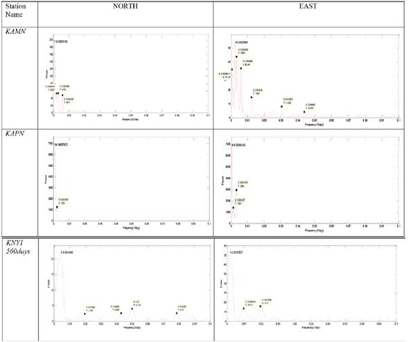 Figure 5 Fourier spectrums of the KAMN, KAPN and KNY1 stations for the north and east coordinate time series.