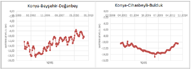 In this study, 19 wells were measured monthly in order to determine the groundwater level changes in the Konya Closed Basin. For the wells in this area, minimum 11-year and maximum 49-year data were available (from 19 stations) (Fig. 2). The time-dependent changes (monthly) of the two wells used to determine the groundwater level changes are given in Figure 6.