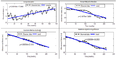 As in the trend analysis of GNSS stations, a trend analysis was performed for 19 wells. The linear functions and annual changes are given in Figure 7 and Table 4. The results showed linear changes in the decreasing direction with a mean of -39.22 cm/year for 19 wells; for example, -15.56 cm/year for three wells in Konya-Cihanbeyli, -63.48 cm/year for four wells in Konya-Selçuklu, -68 cm/year for six wells in Karaman, and -19.50 cm/year for two wells in Nigde. The annual change in the Konya-Selçuklu-Meydan, Karaman-Ayranci-Huyukburun, and Karaman-Merkez-Suduragi wells was over 1 m (Table 4). However, the linear function of the Konya-Kulu and Konya-Seydiçehir wells showed an insignificant linear change at 95% confidence level. In addition, a linear increase (69.72 cm/ year) was detected in the Konya-Beyçehir-Doganbey well. The majority of the water level of the wells in the study area had a statistically significant decrease, and this change was at meter level for some wells.