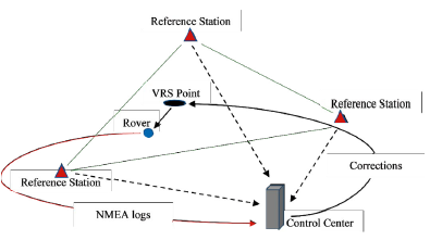 A frequently used correction model in network RTK (NRTK) is the VRS; the operating principle of this is shown in Figure 1. In short, reference stations transmit carrier phase observation and broadcast ephemeris data to the control centre in RTCM format via NTRIP. Subsequently, a rover transmits approximate coordinates to the control centre in the National Marine Electronics Association (NMEA) format via NTRIP. There is two-way communication between the rover and the control centre. CORS software in the control centre creates a VRS point using the approximate coordinates of the rover. The rover then achieves precise positioning by retrieving correction data based on the VRS location and tropospheric conditions from the internet via NTRIP (Wanninger, 1999). The advantages of this method are that they support current RTCM formats (RTCM2.1 and RTCM 3.1), calculate troposphere and ionosphere models at the control centre, and create separate corrections for each rover. There are, however, also disadvantages of this method. These include a limited number of concurrent users (depending on the control centre server capacity) and the necessity to re-initialise when the distance between rover position and VRS point exceeds certain distance limits (Gumus and Selbesoglu, 2019).