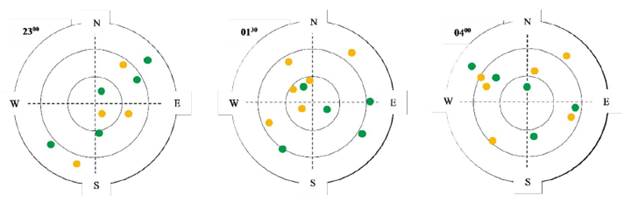The lower integer ambiguity solution rate in PASA station (compared to KEST station) was analysed. Low-level integer ambiguity solution in each of the three CORS geometries of PASA station was observed between 11 pm and 11.30 pm. Between these hours, it was found that only a small number of GPS and GLONASS satellites were observed at PASA station, and they did not show homogenous distribution. Figure 11 shows the GPS and GLONASS satellites at 11 pm, 1.30 am, and 4 am.