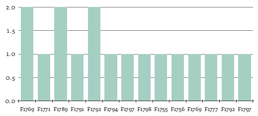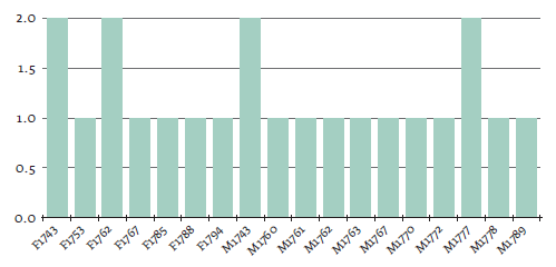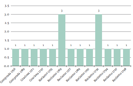 Según las gráficas, hubo diecisiete libertades en Cartagena y veintidós en Mompox, las cuales representan el 44 y el 56 %, respectivamente. Estas con una frecuencia anual entre uno y tres casos de libertad, siendo uno el número de caso que más se repitió de manera consecutiva. Por el contrario, hubo intervalos entre los años en que se presentaron dos y tres casos. Los años en que encontramos más casos fueron 1762, 1767, 1769, 1777, 1789, 1792, 1794 y 1798. Esto supone la existencia de libertades a lo largo del período de estudio y en sus años extremos y no exclusivamente en los años colindantes a la Real Cédula de 1789.