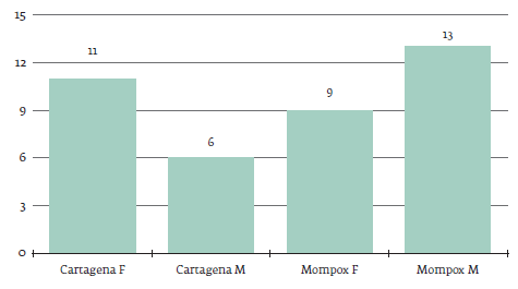 Siguiendo con la variable sexual, encontramos diecinueve casos de libertad en esclavos y veinte casos en esclavas, que representan, respectivamente, el 49 % y el 51 % del total de casos. Entre las veinte libertades en esclavas hubo once en Cartagena y nueve en Mompox (28 y el 23 % respectivamente). Entre las de esclavos hubo seis en Cartagena y trece en Mompox (16 y 33 %, respectivamente). Aunque en Cartagena aparecen más esclavas que accedieron a la libertad, las diferencias no son significativas con respecto a Mompox. Si las hubo en los esclavos, en los que solo hubo seis libertades frente a trece en Mompox. Esto indica que en ambas ciudades la mayoría de libertades fueron en esclavas. La favorabilidad para la adquisición de libertad de las esclavas tuvo que ver con sus condiciones de vida en la ciudad. Allí, relaciones afectivas en el plano amoroso entre amo-esclava o en el plano familiar posibilitó que los amos condescendieran en la otorgación de libertad a sus esclavas. Un ejemplo de libertad de hecho por consideración como familia fue la otorgada en 1677 en la ciudad de La Plata por el capitán Pedro García a Andrea González (Barrero, 2017). Ahora bien, en otros casos, la relación de afectividad entre los amos y sus esclavas, solo plasmada promesas de libertad. Ante lo cual las esclavas se vieron obligadas a proceder mediante litigios para reclamar cumplimiento de dichas promesas. A continuación, el desenvolvimiento de la libertad según el sexo de los esclavos en ambas ciudades.
