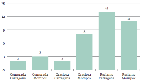 En cuanto a similitudes, en ambas ciudades prevalecieron las demandas de libertad, las cuales, junto con la opción de compra, sumaron veintinueve de los treinta y nueve casos existentes. Esto da cuenta de acciones e iniciativas por parte de los esclavos para obtener la libertad. En las demandas, la acción principal fue acudir a la justicia para solicitar amparo, reconocimiento de sus derechos, alegar contra los amos e instarlos a la presentación de instrumentos de prueba de pro- piedad sobre ellos. Entre ellas, catorce demandas corresponden a las esclavas y diez a esclavos. Siendo las esclavas mayoría y con un comportamiento casi parejo en ambas ciudades (ocho esclavas demandaron en Cartagena y seis en Mompox).